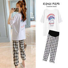 苒琦妈咪孕妇夏装套装时尚款潮妈两件套网红款宽松休闲T恤上衣格子九分裤 白色上衣+格子裤子【套装】 M