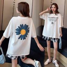 伊沐纯孕妇装套装夏孕妇短袖T恤上衣外穿短裤潮妈夏季两件套 白色上衣+格子短裤 XL