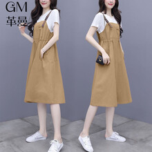 革曼 孕妇装夏装2021新款假两件套孕妇连衣裙夏季时尚潮妈短袖孕妇背带裙宽松裙子 粉紫色套装 L