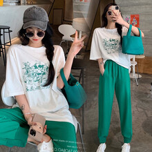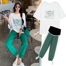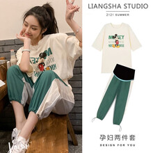 卓贝欣孕妇装夏季套装印花短袖T恤孕妇托腹休闲裤时尚款两件套孕妇装潮妈夏装 米色上衣+拼色孕裤 XL