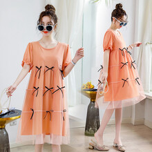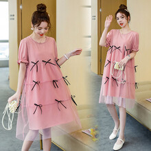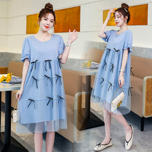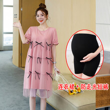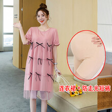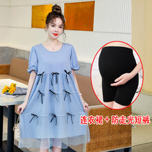 孕妇装夏装2021新款薄款孕妇夏装连衣裙时尚款外出潮妈夏季套装上衣短袖裙子 蓝色裙子+肤色安全裤 L【建议115-130斤】