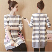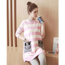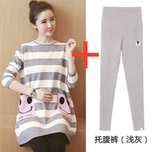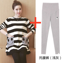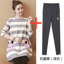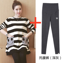 孕妇装秋冬装时尚孕妈装春秋季套装宽松外穿孕妇连衣裙加厚保暖孕妇打底裤裤子新款条纹上衣 黑色+黑色托腹裤 L