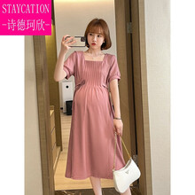 诗德珂欣【甄选精品】孕妇夏装雪纺连衣裙网红潮妈洋气方领时尚款宽松遮肚不显怀裙子夏 杏色 M
