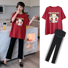 孕妇裤夏天外穿宽松舒适孕妇装夏装时尚新款托腹孕妇打底短裤夏季孕妈装休闲孕妇T恤短袖上衣孕妇套装 红色上衣 M