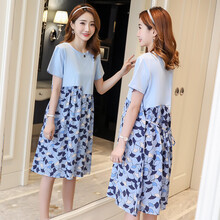 孕妇装连衣裙夏季新款宽松夏装中长款大码时尚拼接圆领短袖孕妇裙子外穿薄款夏天孕妈装 魅力粉 M