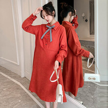 郁莎 孕妇裙2021秋装新款时尚蝴蝶结网红连衣裙过膝长款潮妈孕妇装 蓝色 L
