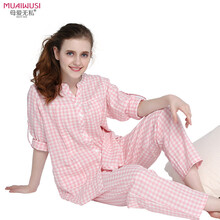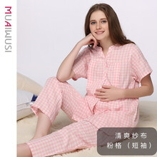 母爱无私 夏季纯棉双层纱布月子服薄款长袖孕妇睡衣夏季哺乳装产后坐月子喂奶衣开衫 灰色格子 L码(合适125-140重)纯棉柔软舒适孕产无忧V领设计