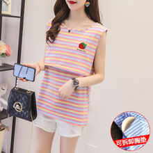 楚歌质优品 免穿文胸产后时尚辣妈纯棉哺乳背心夏季外出喂奶短袖T恤上衣套装 501草莓彩虹 L码建议99-117斤